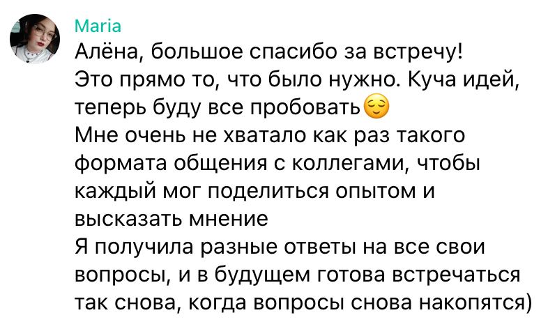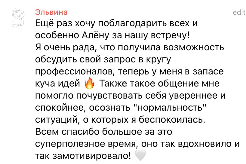 Самое главное, что мастермаинд это безопасное место где можно пожаловаться, поделиться, рассказать о своих успехах и неудачах. Ведь тут люди, которые проходят через те же взлеты и падения, и они всегда готовы оказать поддержку.