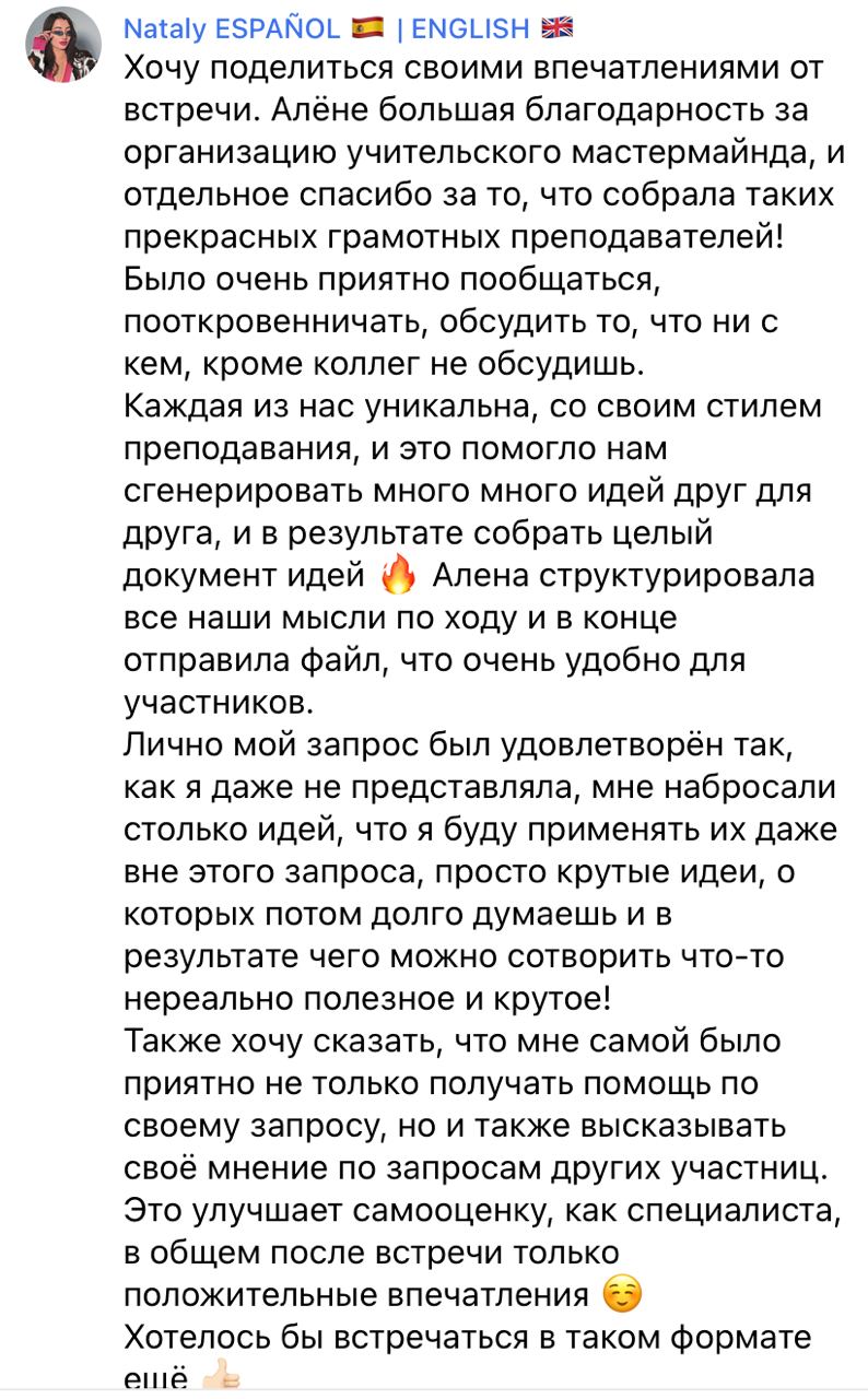 В профессиональном развитии преподавателя наступает момент когда уже чувствуешь, что готов делиться с другими, но еще не понимаешь как и синдром самозванца говорит, что нужно молчать. На мастермаинде можно делиться любым свои опытом и ощутить что ваши идеи ценны, важны и нужны другим. Когда мы делимся с другими, то обучаемся сами.